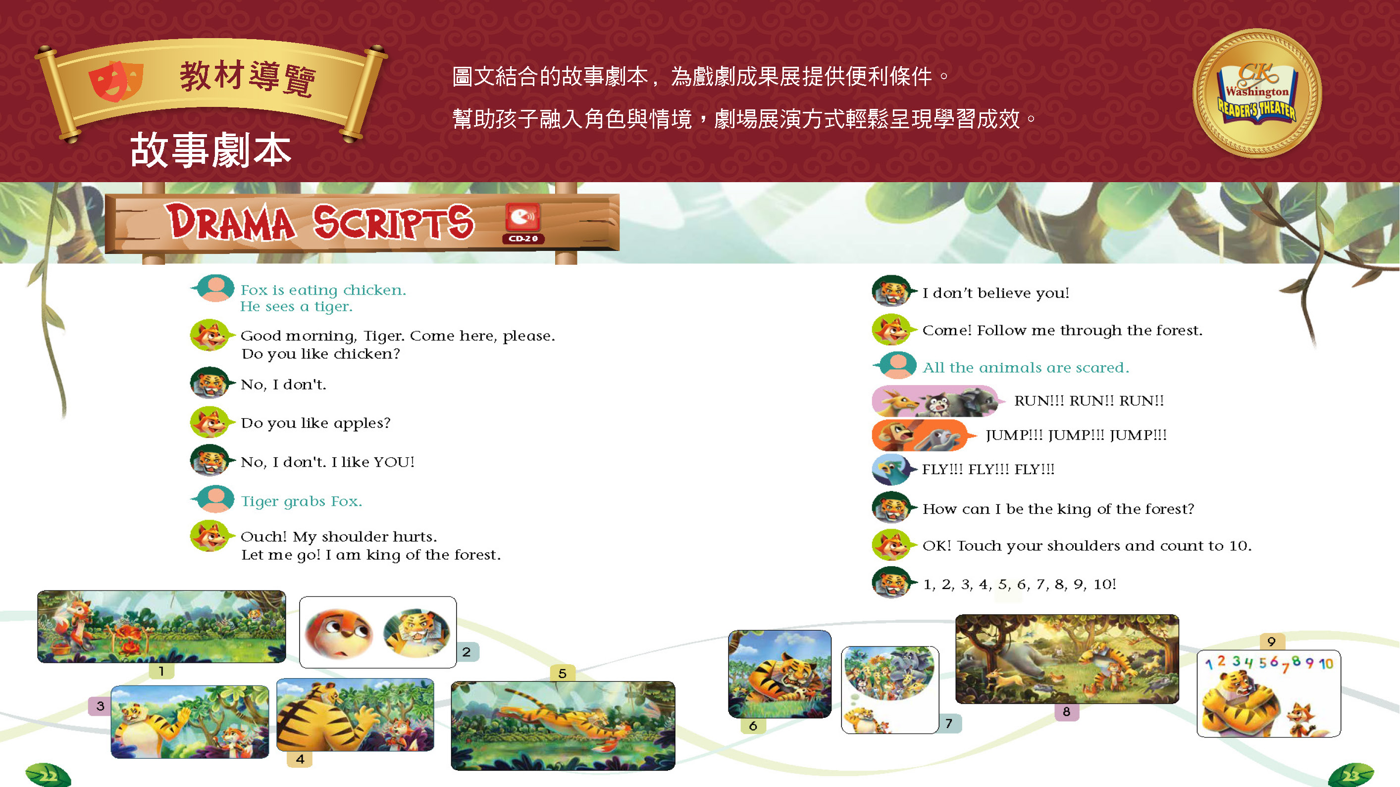 事對話腳本,便於老師在課堂中分角,讓孩子以舞台表演展現學習成果。