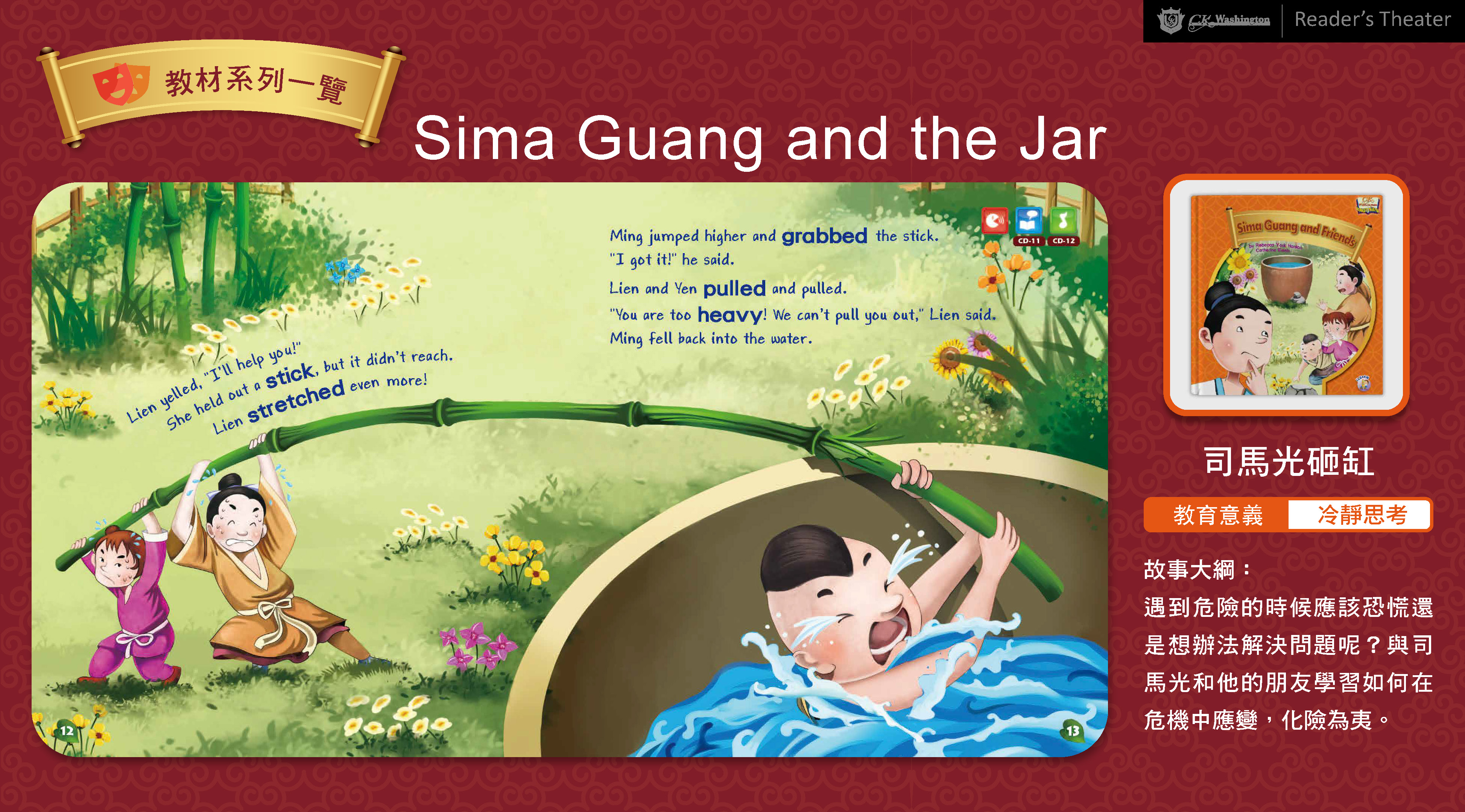 • 每冊繪本皆附一片CD,內容收錄故事朗讀音檔、各頁歌曲、歌曲卡拉、單字表、劇本朗