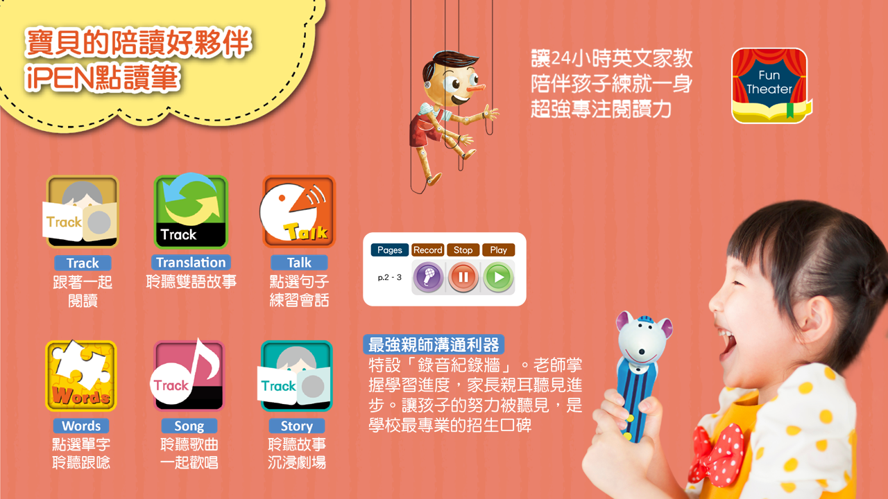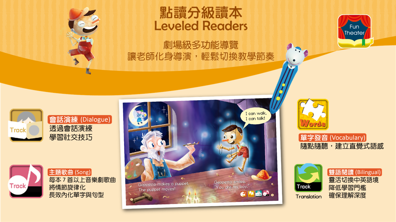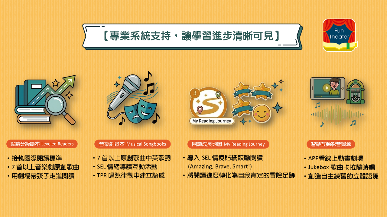 ■ 專業系統支持,讓學習進步清晰:點讀分級繪本、音樂劇藝術歌本、閱讀之旅貼紙地圖、智慧互動影音資源